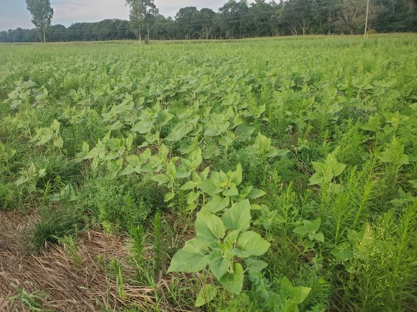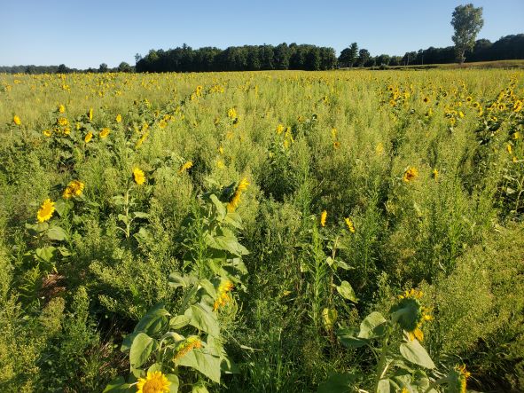 Sept 1 2022. Here is the field of sunflowers. They are short and as you can see lots of weeds too. I will get a crop pf seeds for our sunflower oil. The good thing is this field will be a pasture next year and the crimped rye underneath will help the soil health. First I will bush hog the sunflower stocks once it is combined. I will not till it but run it over with a disc and then broadcast various seeds for the pasture and also clipping any weeds before they flower during the summer.