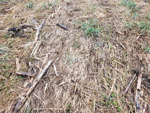March 2022 showing the crimped rye from last year which is just starting to show some of the red clover I planted in the sunflowers.