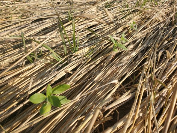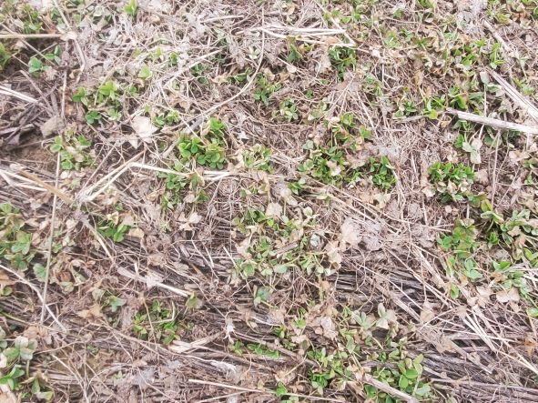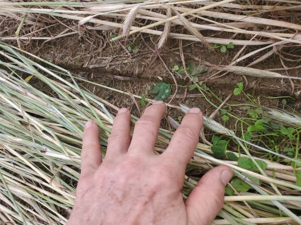 March 16 2023 The clover is coming through on last years sunflower field. Notice the crimped rye still visible and starting to decay.