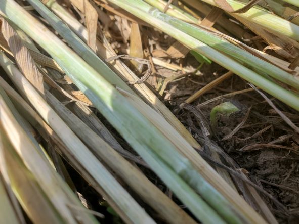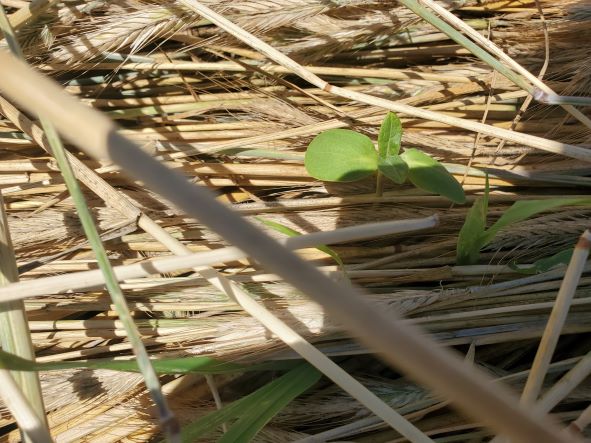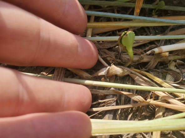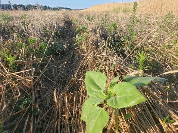 May 30 2024 The first sunflower emerging through the crimped rye.