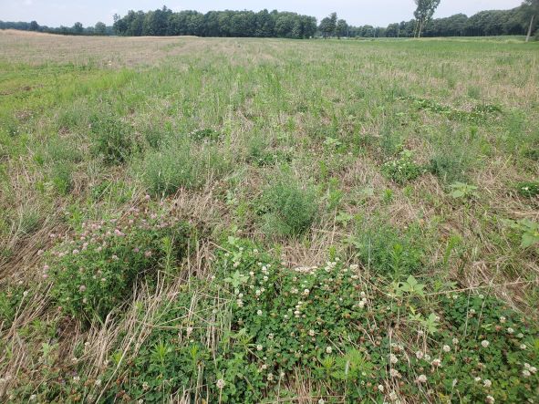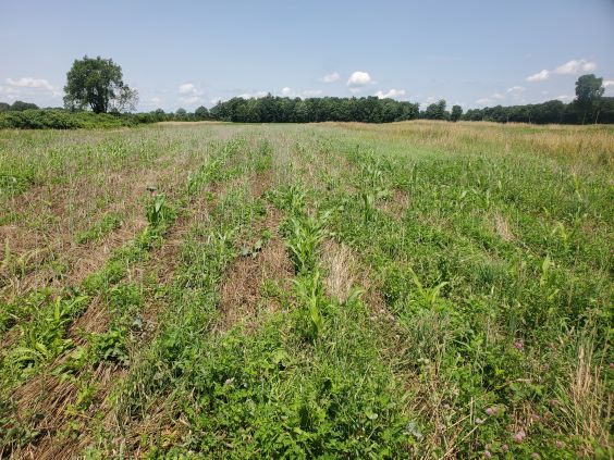 July 12 2023 The corn is not doing so well but there is corn there and growing every day. A few weeds too and lots of clover.