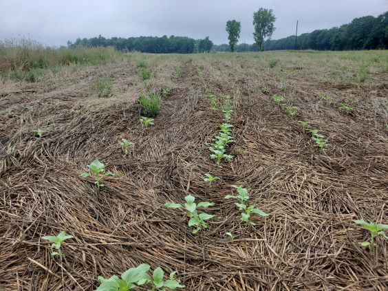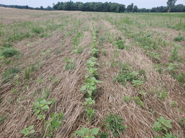 July 3 2023. Sunflowers are showing well and coming up through the crimped rye. Just too many sunflowers so I need to reduce the seeds per acre. Been very wet lately.