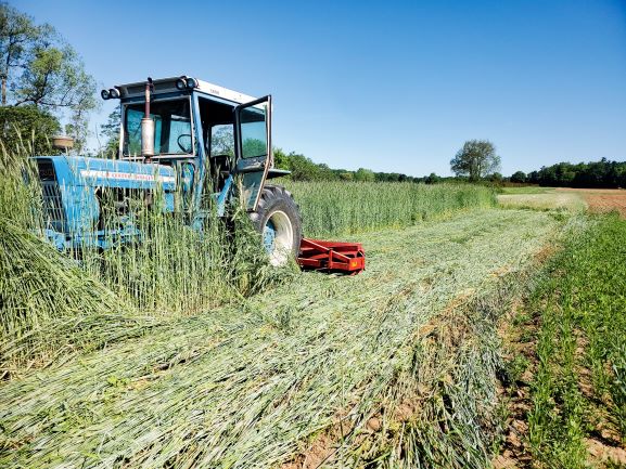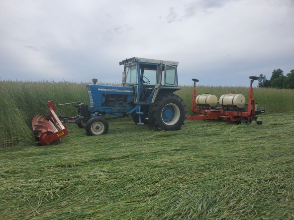 Spring of 2021 crimping the rye. The method of having the crimper on the rear of the tractor does not work well as the rye pushed down by the tires just comes back up so for 2022 I will put the crimper on the front of the tractor and put the planter on the rear and do the crimping and planting at one pass.
