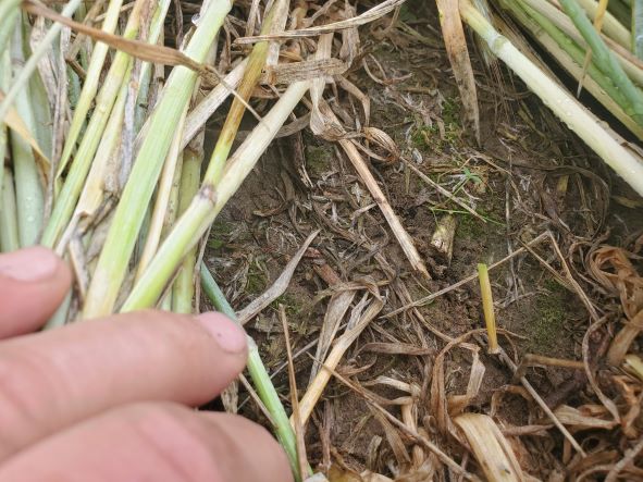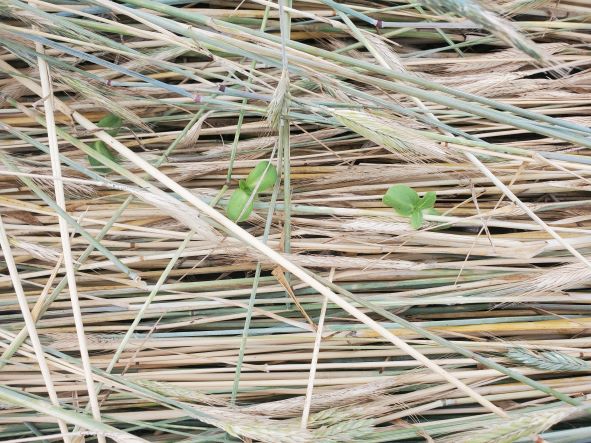 June 24 2023 Sunflowers appearing through the crimped rye!!! There seems to be little difference in the germination of the sunflowers under the crimped rye and the areas with little rye cover.