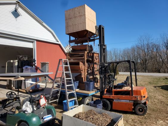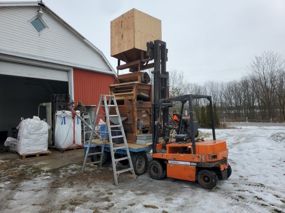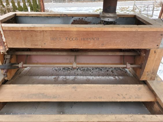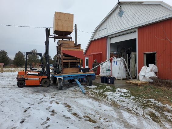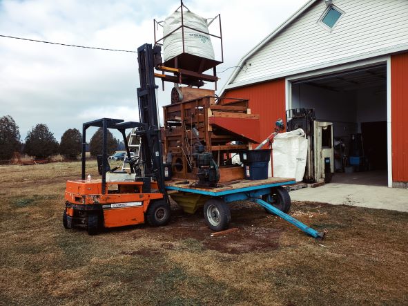 Dec 13 2022. This is the setup for cleaning the sunflowers. It is driven by a small Lister diesel and needs two forklifts. Works fairly well but I need to make a smaller screen since too many very small sunflowers are being put in the trash.
