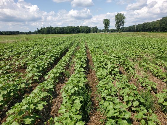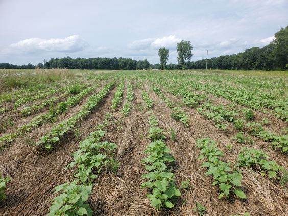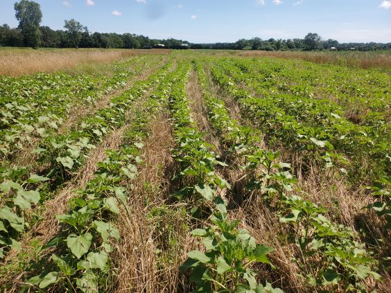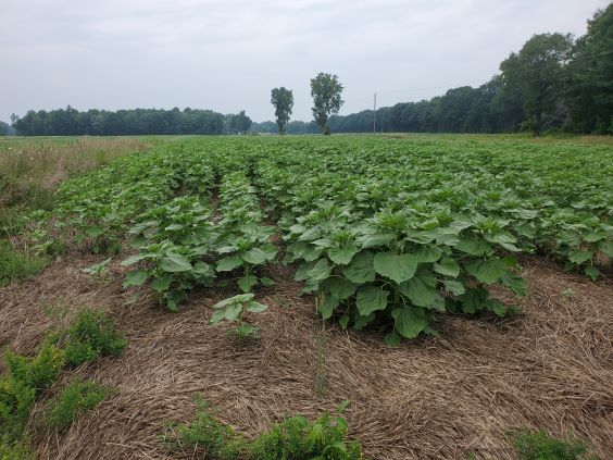 Sunflowers showing in the crimped rye summer of 2021. I was very impressed with the result as this was my first attempt at planting sunflowers in crimped rye. I did notice that the germination rate was a bit low so for 2022 I am going to plant a higher population and roll the field after planting to help insure good soil to seed contact.