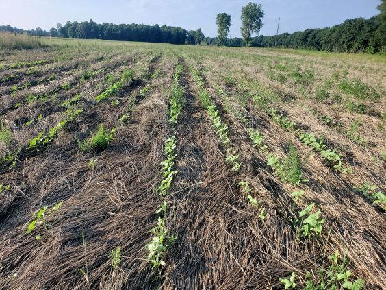 June 11 2022. I removed the crimped rye covering. This photos shows that my closing wheels may not have worked that well. Since I am planting into the crimped rye I can't use a slotted wheel since it would bind up. Maybe I just needed more spring pressure on the closing wheels.