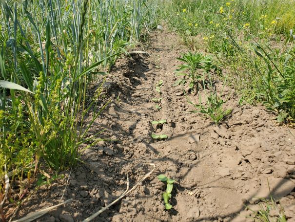 July 6 2022. This is a start of a row of sunflowers. Still no rain but there are a few sunflowers showing so the crimped rye is helping reduce the evaporation but more rain would be better.