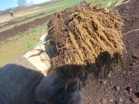 April 15 2022. Yes! That is rehizosheaths formed on the rye roots. This shows that there is indeed some microbes doing their work. I was just weeding some of the beds when I noticed the wonderful coating of the roots by the microbes. |