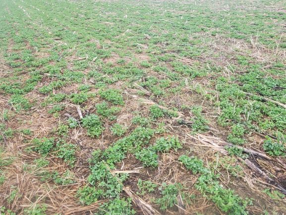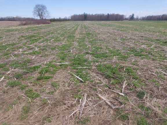 April 15 2022. Looking down the last season cultivated sunflower field showing the red clover coming on strong shown below closeup.