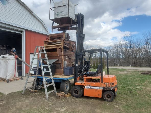 April 17 2022. Finally got the Clipper seed cleaner working well. Here I am cleaning sunflower seeds that I harvested last fall. The Cleaner is run by a small diesel engine which took some time to get all the correct sizes of pulleys to make it run well. |