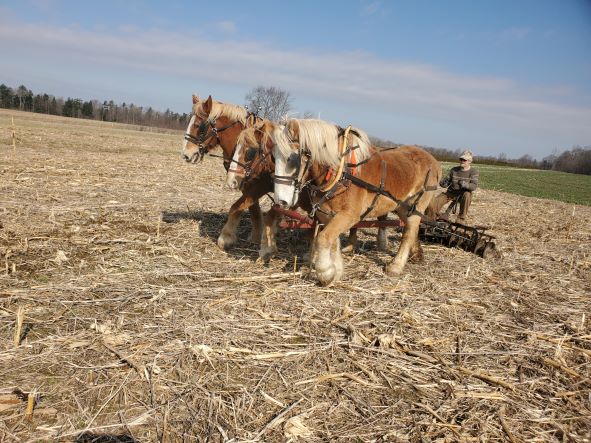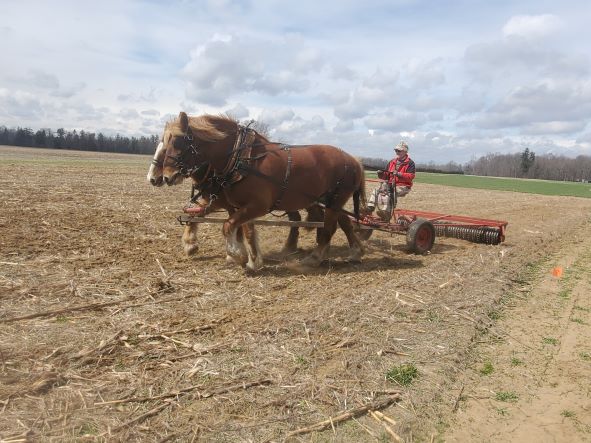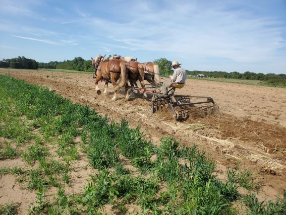 May 30 2021. Decided to get the horses out and do the last minute discing to discourage the weeds before planting the corn. I purchased a rolling basket which I welded up and attached to the horse drawn disk which works well. I would rather do more planting with the no till drill but that's for next year and better planning on my part. |