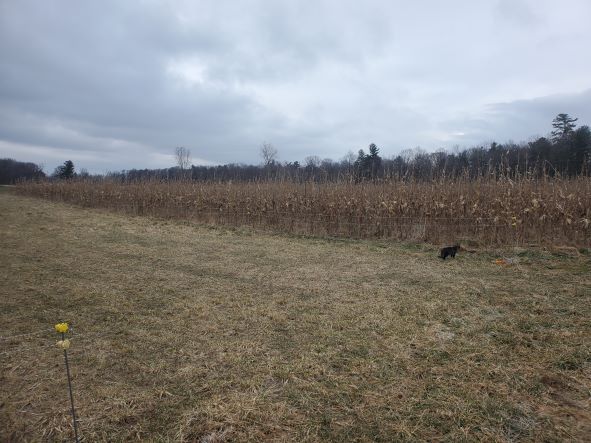 The corn field on Jan 15 2022. We could not combine the corn as there was some mould on the cobs so we decided to hand pick which is on going. I will bush hog the stalks and let the red clover take over and be a pasture without tilling.. |