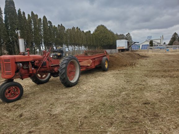 April 15 2022. Spreading mushroom compost on the garden beds using a manure spreader which worked very well. |