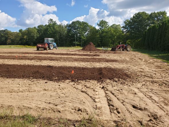 Sept 10 2021: Laying out the field garden with Mushroom compost. We used the manure spreader to put down the compost in long lines. |