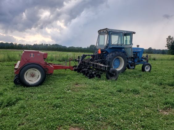 Sept 10 2021: Using the coulter cart and seed drill to over seed the pasture. |