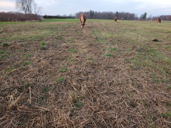 Nov 20 2023 This is a good view of the residue left after a crop was finished and the crimped rye has been broken up by the horses. There is also some clover coming through which will be ready for spring! |