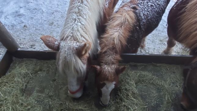Jim and Sorrel friends again eating chopped hay