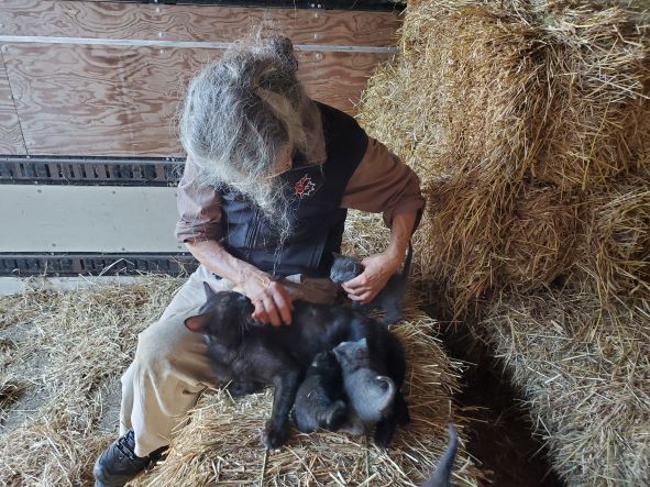 Dorothee getting fresh spelt bread from the wood fired oven. Early January 2021