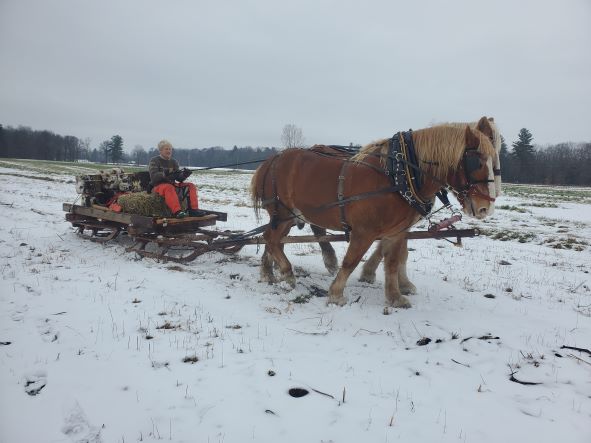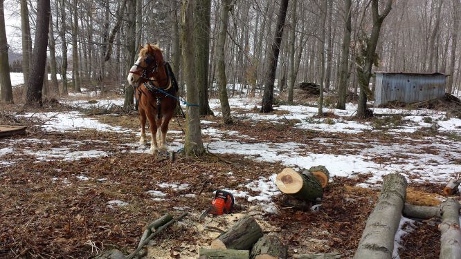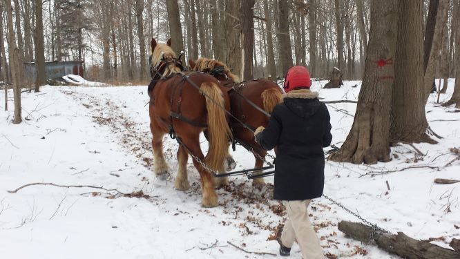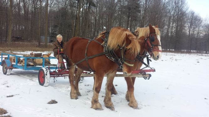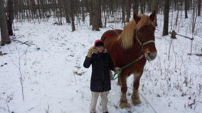 Dorothee pulling logs in our woods